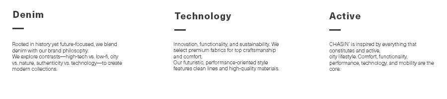 Our brand values are the heartbeat of our identity, driving us to craft performance jeanswear collections. Step into the world of CHASIN’ where every stitch, cut, and design embodies our brand values. Denim, Technology and Active.