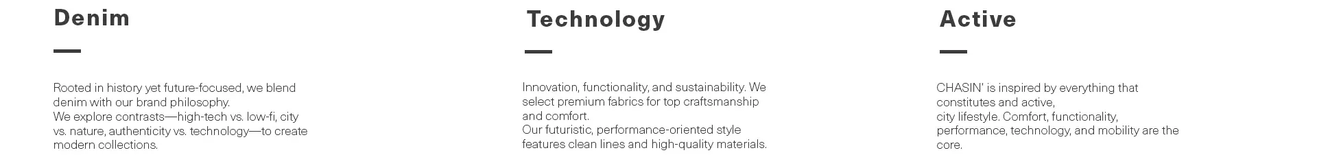 CHASIN’ is a modern performance jeanswear brand for men, rooted in an active city lifestyle. We bring authenticity and technology together in a modern jeans collection. Our brand values are: Denim, Active, and Technology.